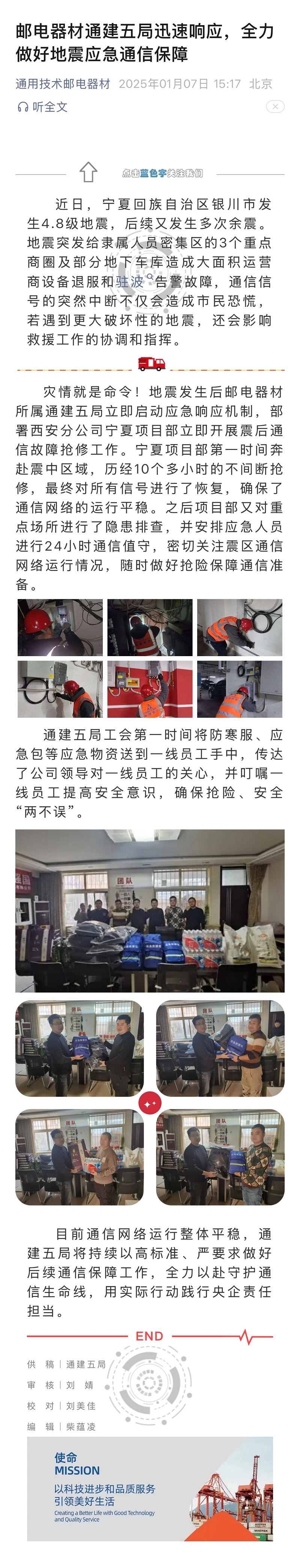 邮电器材通建五局迅速响应,全力做好地震应急通信保障